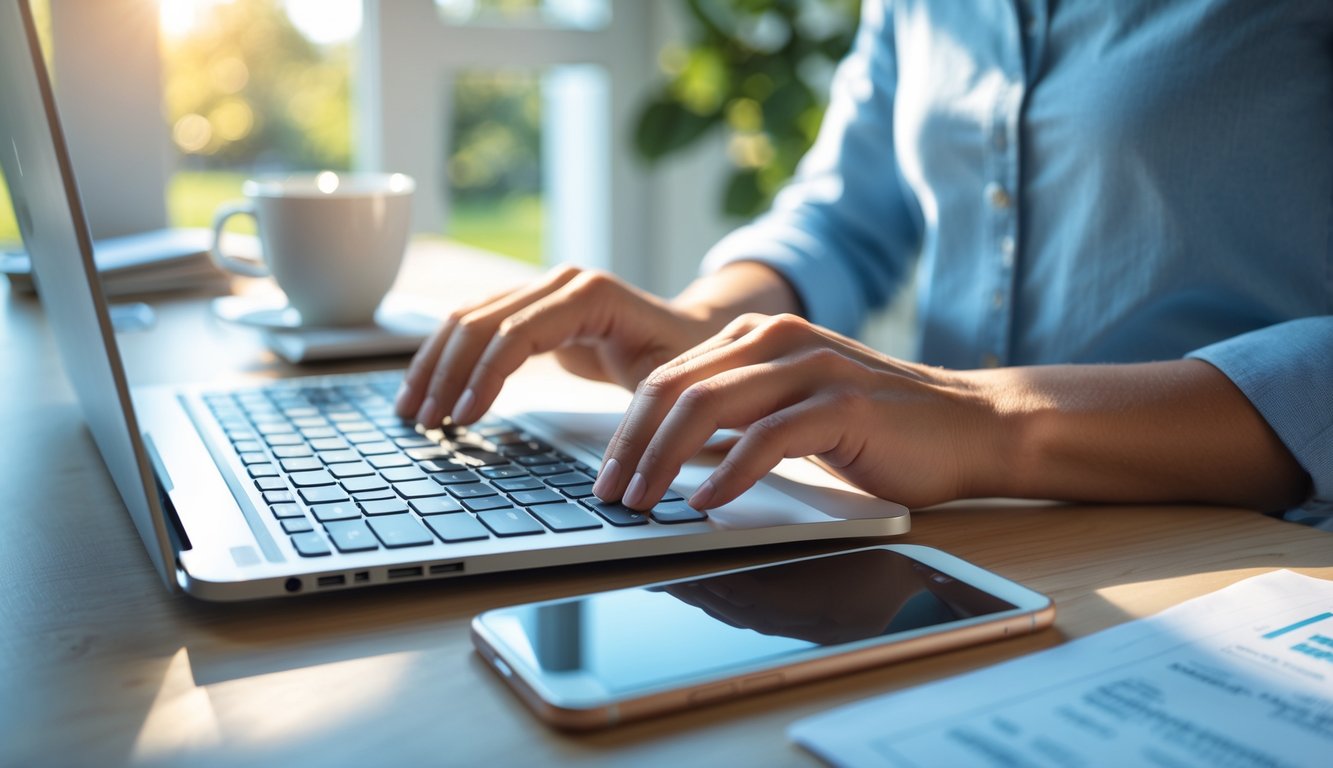 Person using a laptop at a tidy desk to collect rent electronically in a bright home office.