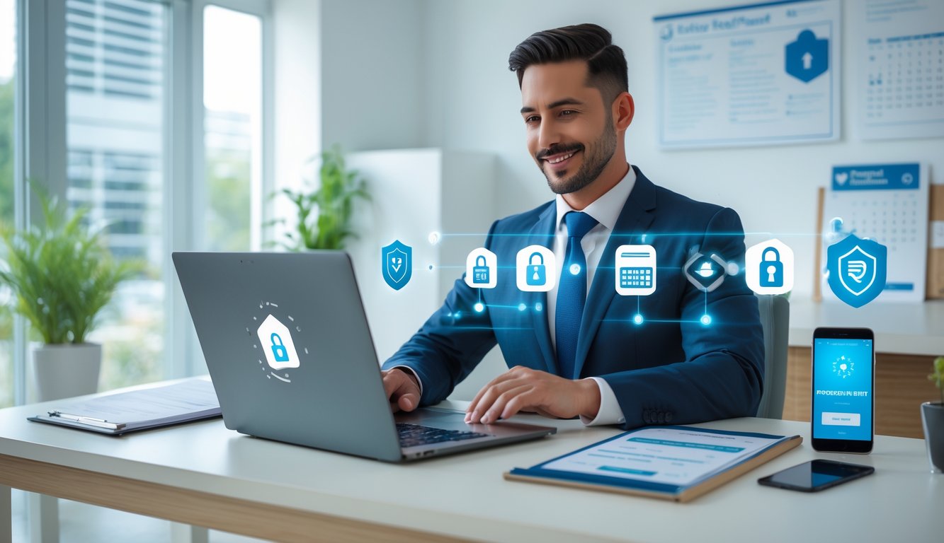 A landlord using a laptop to securely collect rent electronically in a bright office.