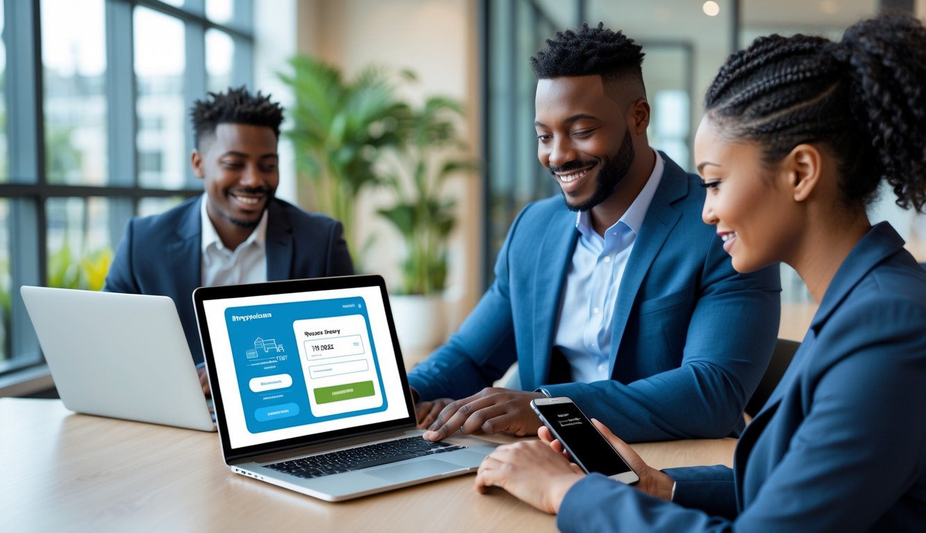 A property manager and tenant using a laptop and smartphone to complete an electronic rent payment in a modern office.