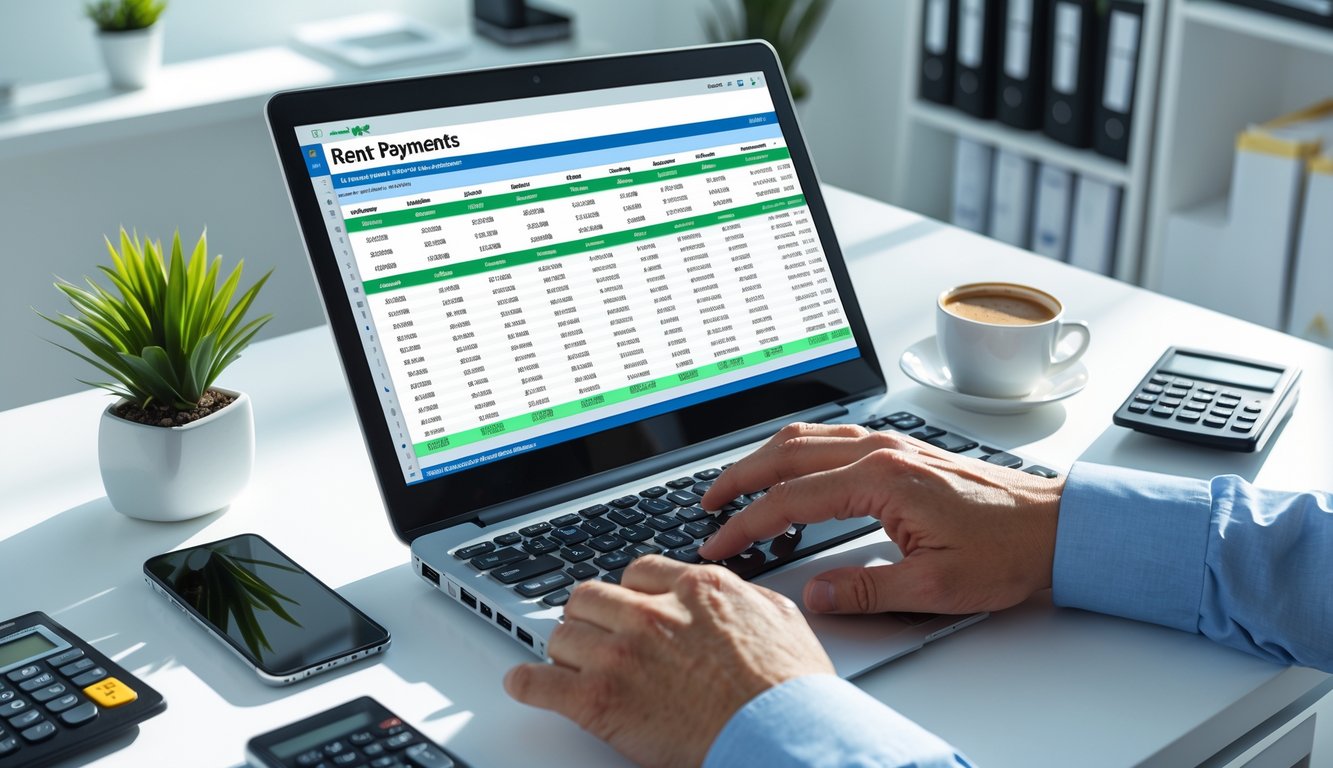 Person at a desk using a laptop to record electronic rent payments in an office setting.